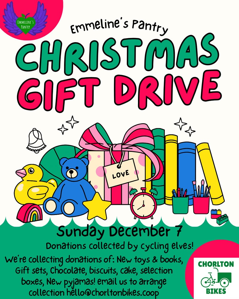 Give a little extra for those in need this Christmas and the Zero Emission Cycling Elves from Chorlton Bikes will collect and deliver for you. Give a pedal-powered Christmas gift – new toys and books, gift sets, chocolates, biscuits, cake, selection boxes, new PJs and similar are all welcome. Contact the Cycling Elves to collect at hello@chorltonbikes.coop