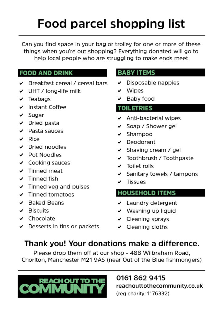 Best known for giving help to homeless people, Reach Out to the Community also make up parcels for local families referred to them by Social Services and partner support agencies.